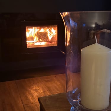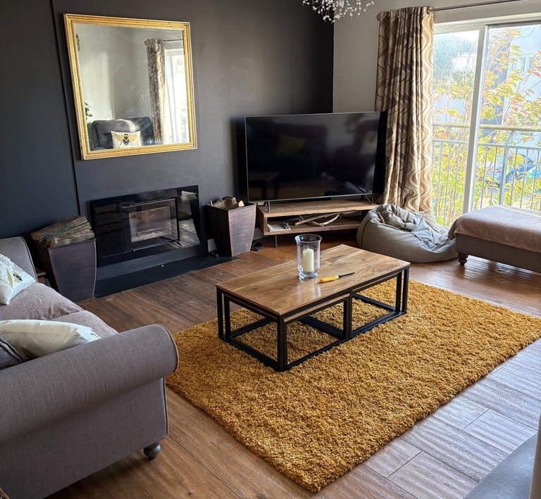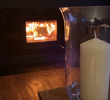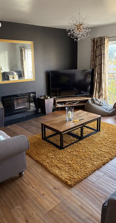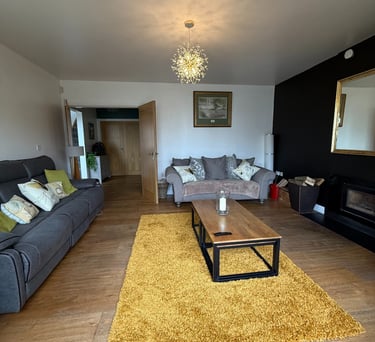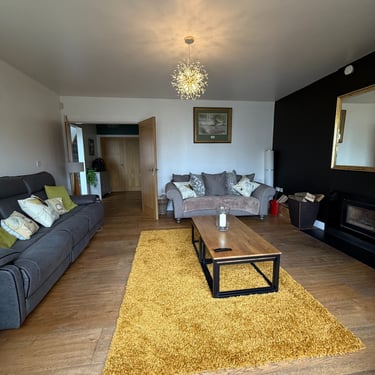 Comfortable lounge with 65" flat screen TV, wood-burner and seating for 6-8 people