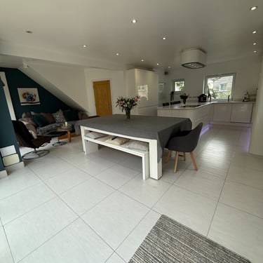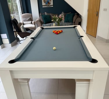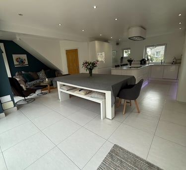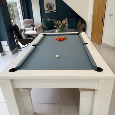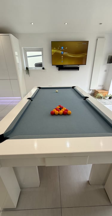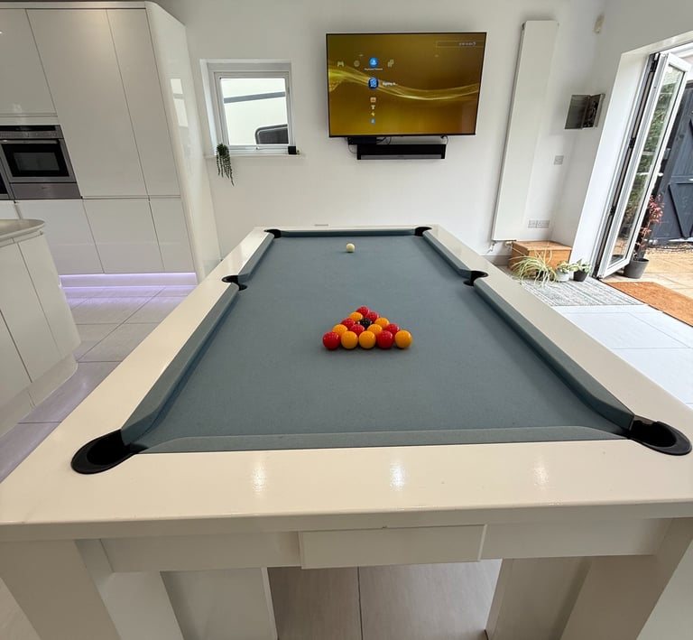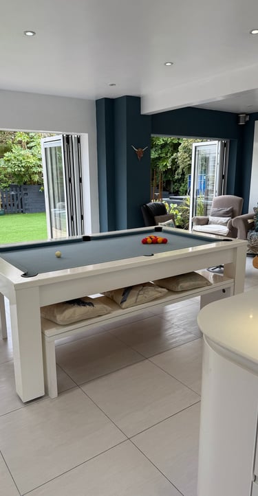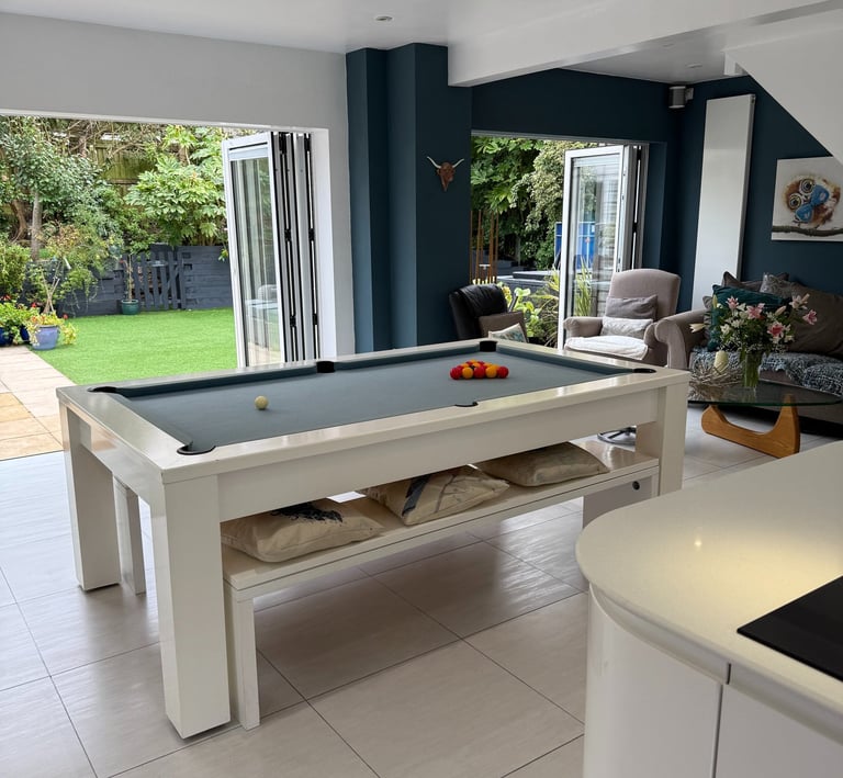 Spacious kitchen diner with sofa & breakfast bar. Slate bed pool table, that doubles as a large dining table, able to accommodate up to 10 people.