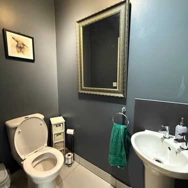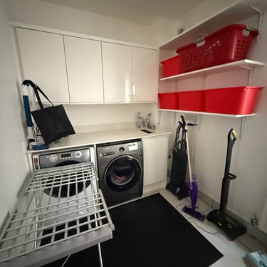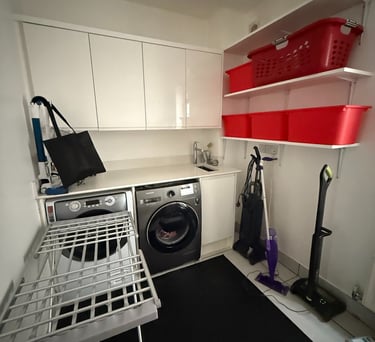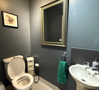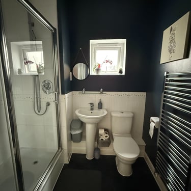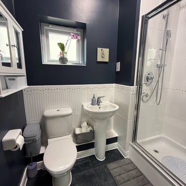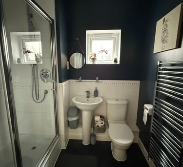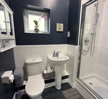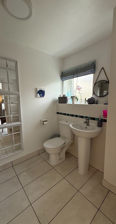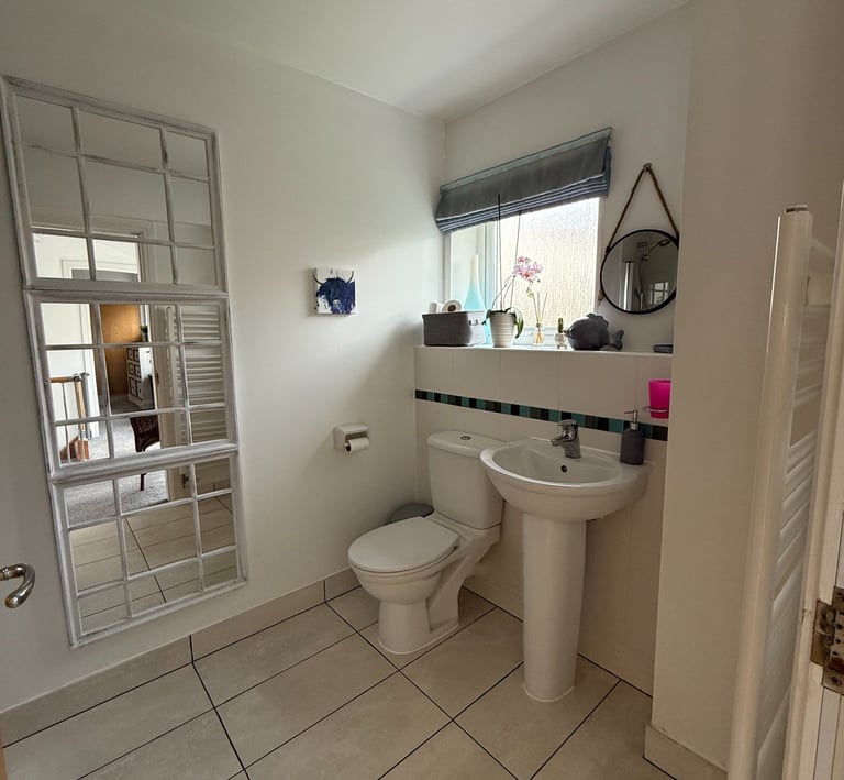 Main bathroom with shower over bath and ground floor WC. Utility room has washing machine, tumble dryer, iron & ironing board, airers, vacuum.