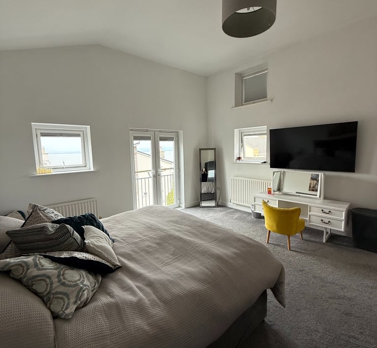 Roomy master bedroom featuring a 65" flatscreen TV and attached bathroom